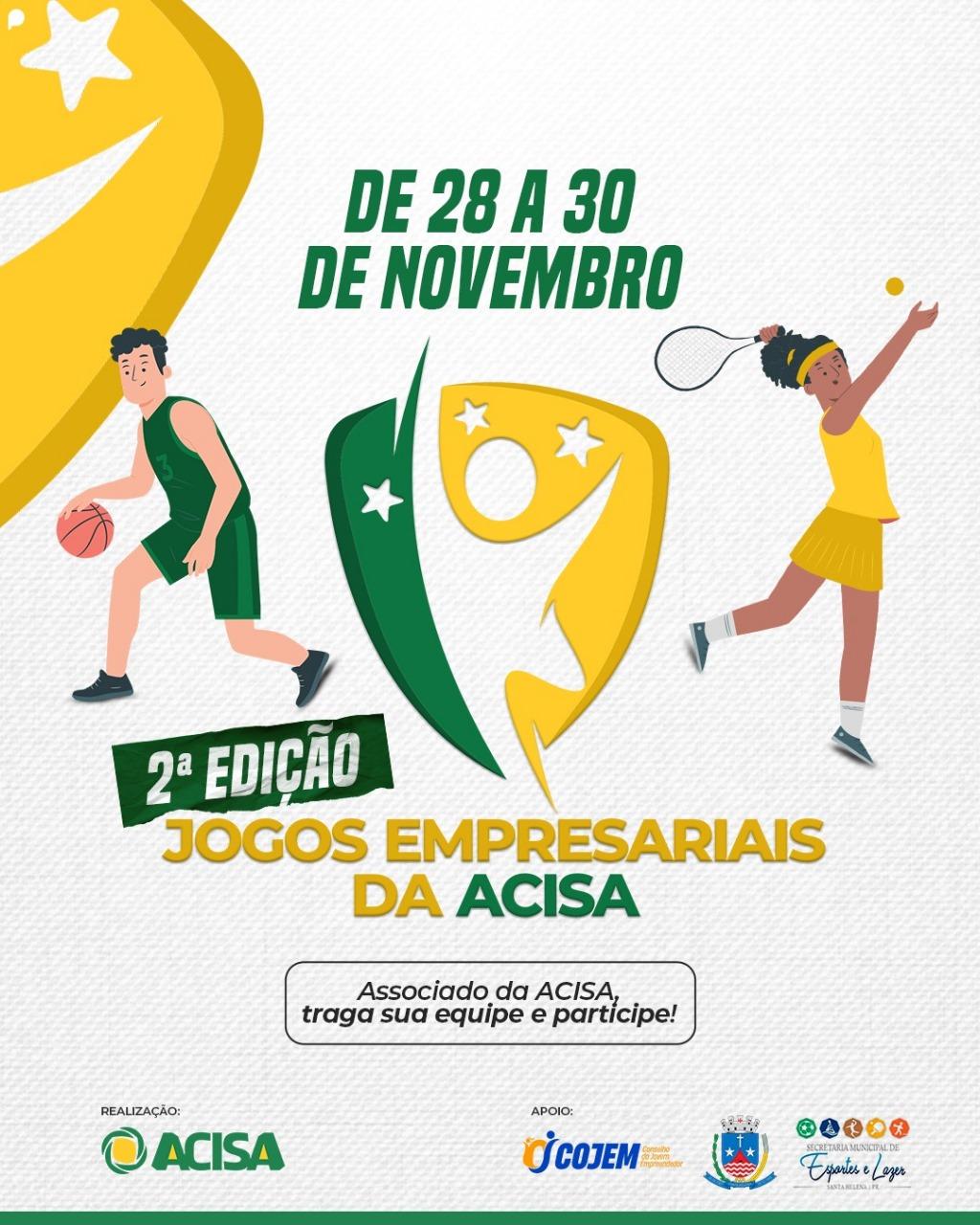 A Associação Comercial Empresarial de Santa Helena (Acisa) organiza os Jogos Empresariais da Acisa, competição esportiva que busca fortalecer a integração, cooperação e espírito esportivo entre empresas associadas. O evento amador, que será realizado de 28 a 30 de novembro, na Praça Poliesportiva de Santa Helena, envolve uma série de modalidades, obedecendo sempre ao regulamento específico, que pode ser acessado ao clicar aqui.