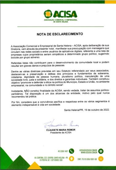 Acisa - Associação Comercial e Empresarial de Santa Helena, divulgou nota de esclarecimento nesta quarta-feira (19), onde manifesta preocupação com a existência de mensagens que circulam em grupos de aplicativos sociais, de cunho discriminatório partidário.
