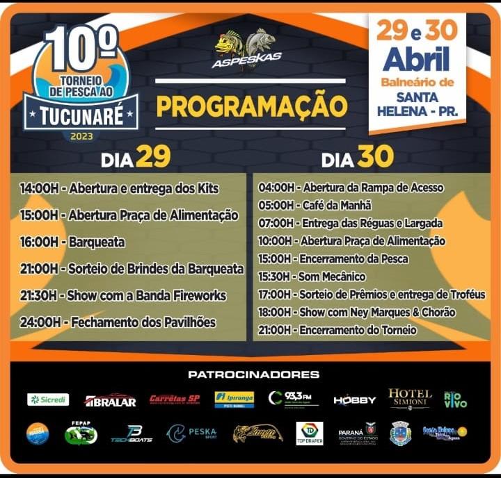 O 10º Torneio de Pesca ao Tucunaré de Santa Helena é uma realização do município de Santa Helena em parceria com a Associação de Pesca Esportiva Kai&Sara (Aspeskas), e consiste da modalidade ‘pesque e solte’.