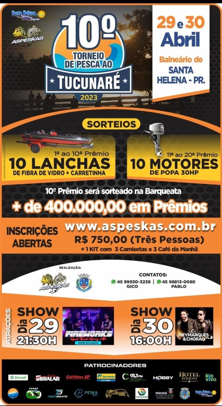 Estão abertas as inscrições para o 10º Torneio de Pesca Esportiva ao Tucunaré em Santa Helena, evento que reúne equipes de todo o Brasil e países como o Paraguai e Argentina. Para esta edição foram disponibilizadas 400 inscrições, o que torna o torneio um dos maiores da América Latina.