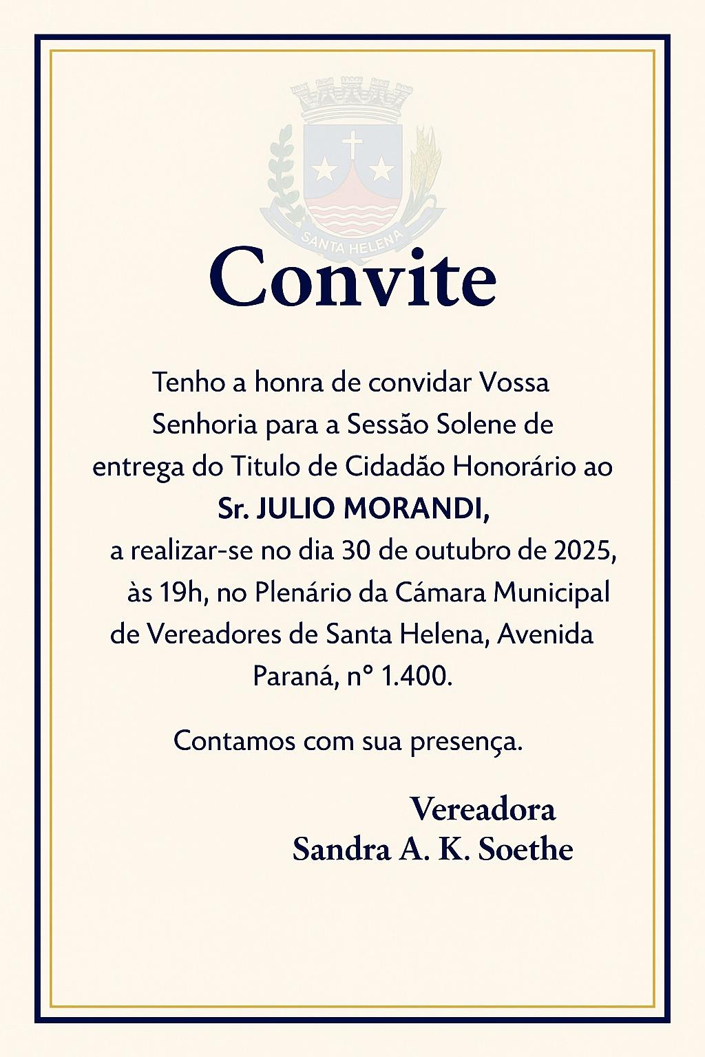 A Câmara municipal de vereadores de Santa Helena realizará nesta quinta-feira (30), uma sessão solene para entrega do título de cidadão honorário ao ex- prefeito Julio Morandi.