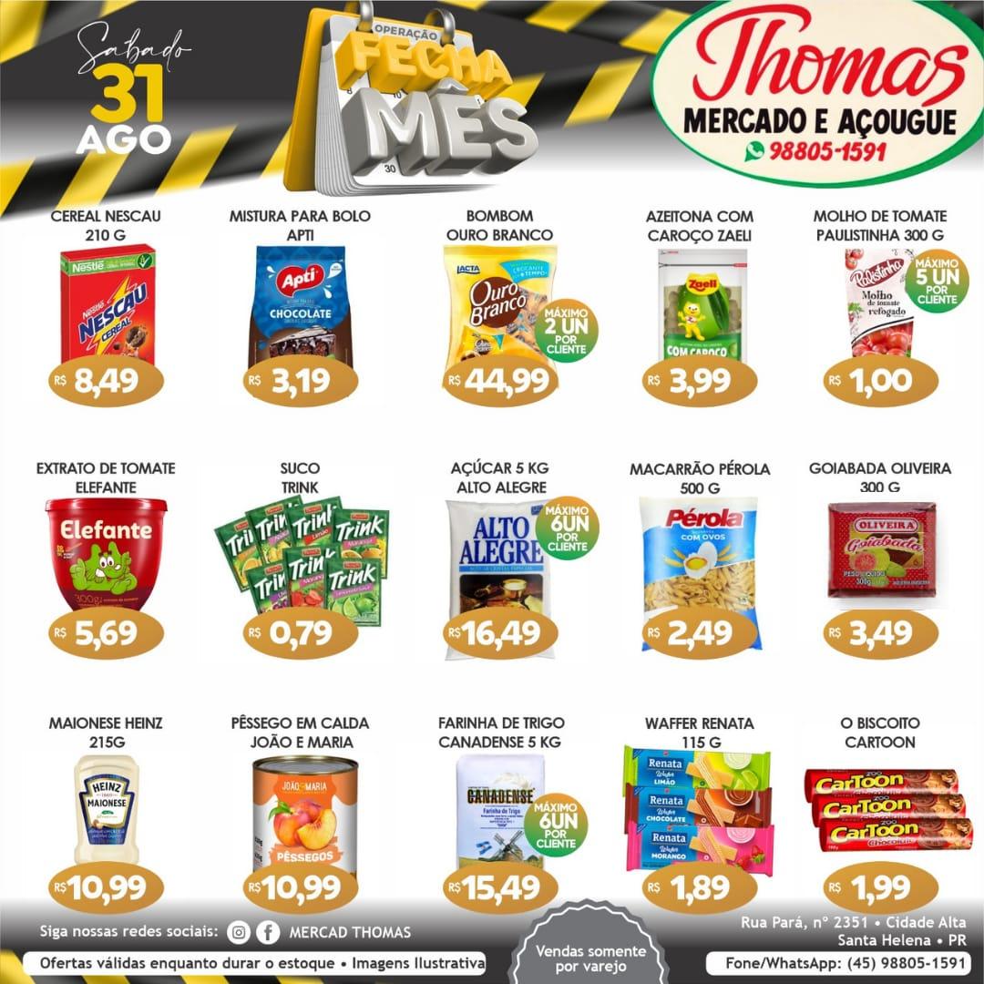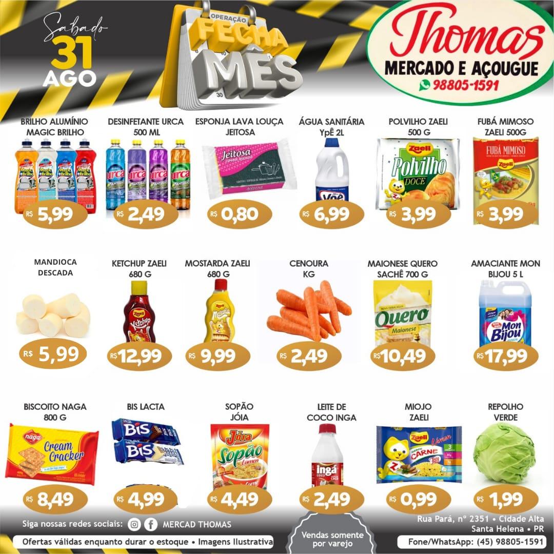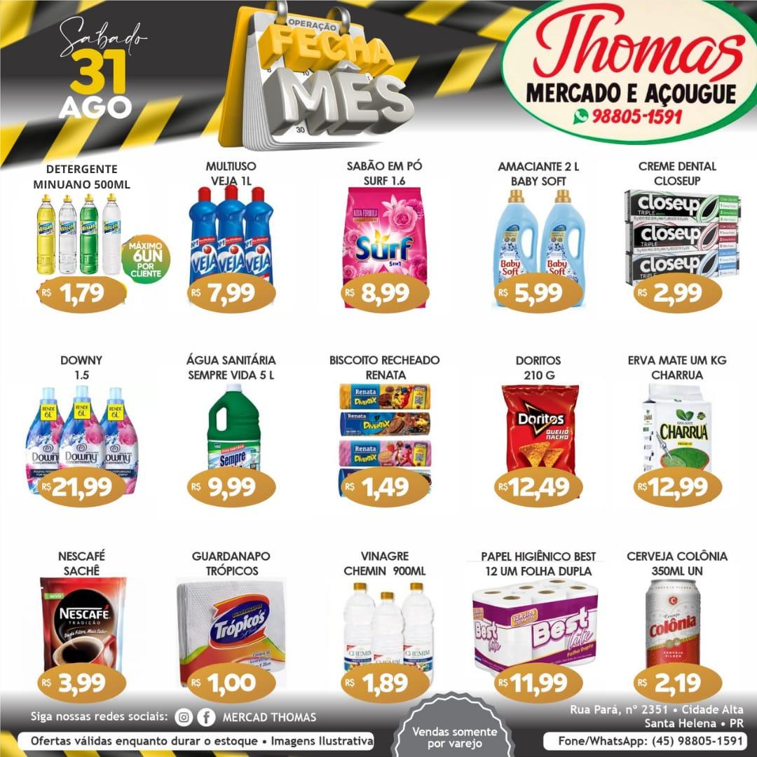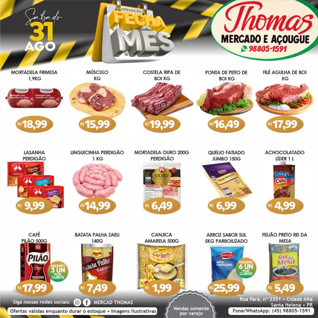 O MERCADO E AÇOUGUE THOMAS preparou para você um super show de ofertas para fechar o mês de agosto com economia e produtos de qualidade. Confira a quantidade de produtos em oferta neste sábado (31/8), no FECHA MÊS do MERCADO E AÇOUGUE THOMAS, lembrando que que é somente neste SÁBADO, dia 31.