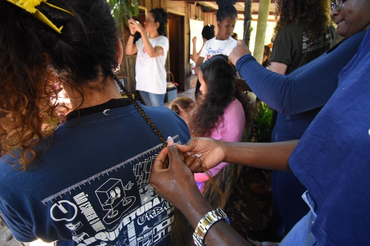 Em seguida, uma oficina de tranças, comandada por Lilian Freitas e Ester Ferreira, retomou práticas ancestrais de cuidado e estética afro, reunindo participantes de diferentes faixas etárias.