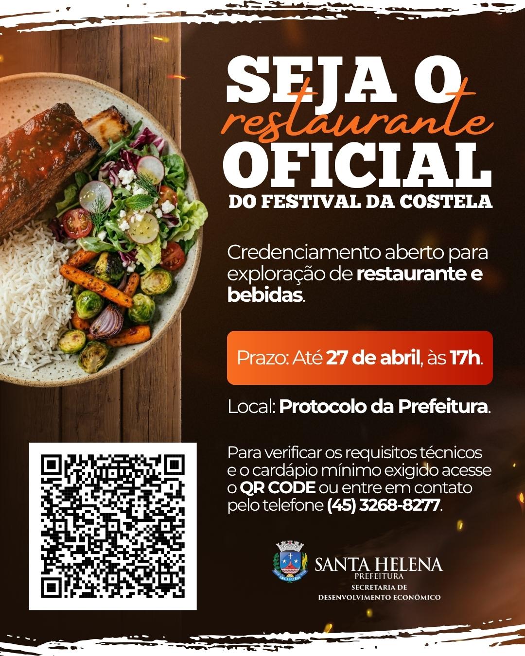 A Prefeitura de Santa Helena, por meio da Secretaria Municipal de Desenvolvimento Econômico, inicia no dia 4 de maio o período de inscrições para a 4ª Edição do Festival da Costela Bovina. O evento integra as festividades do 59º Aniversário do Município e será realizado no dia 24 de maio, no Balneário Municipal.