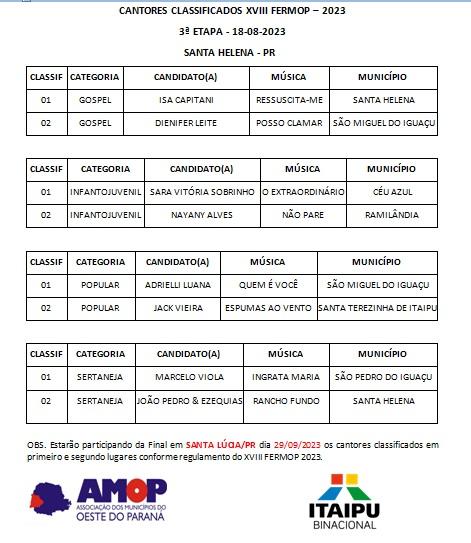 Confira na imagem, a lista completa dos classificados, música interpretada e cidade de origem A secretária de Educação e Cultura, Ana Paula da Silva, destacou a participação dos santa-helenenses e enalteceu o sucesso do evento.