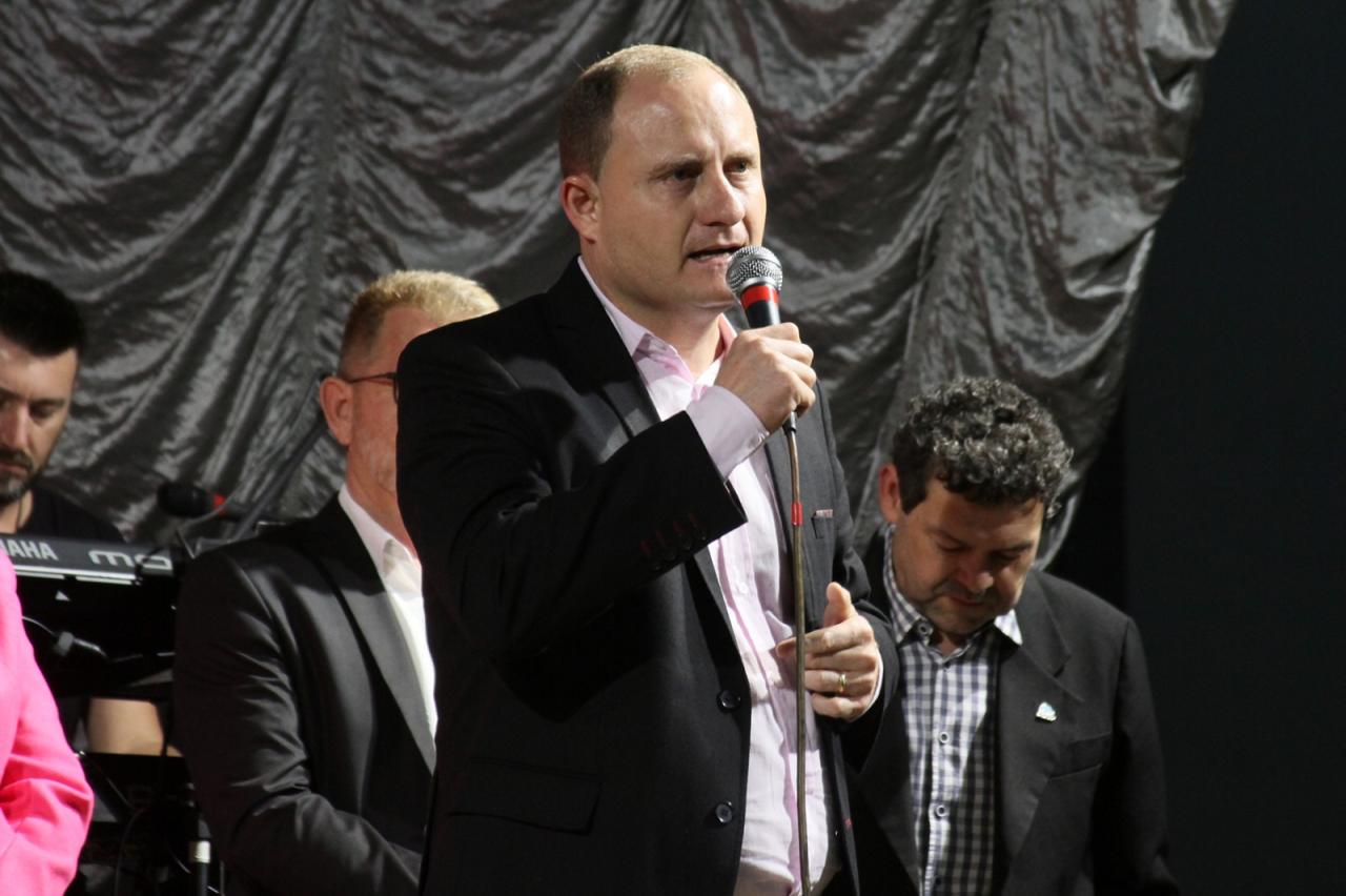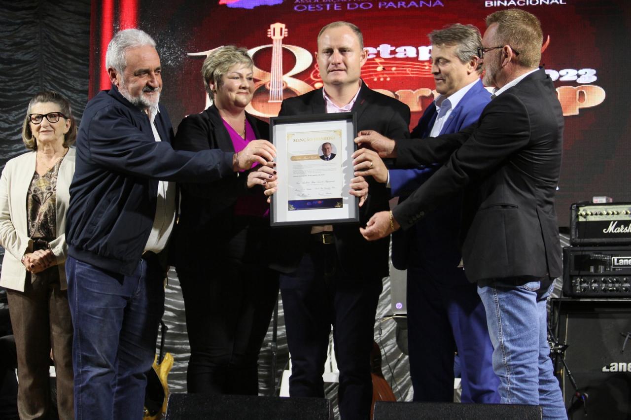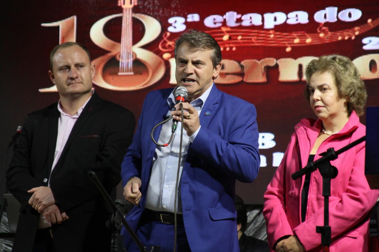 O prefeito Evandro Grade, o Zado, recepcionou autoridades, artistas e a população. Presença do presidente da Amop, prefeito de Toledo, Beto Lunitti.