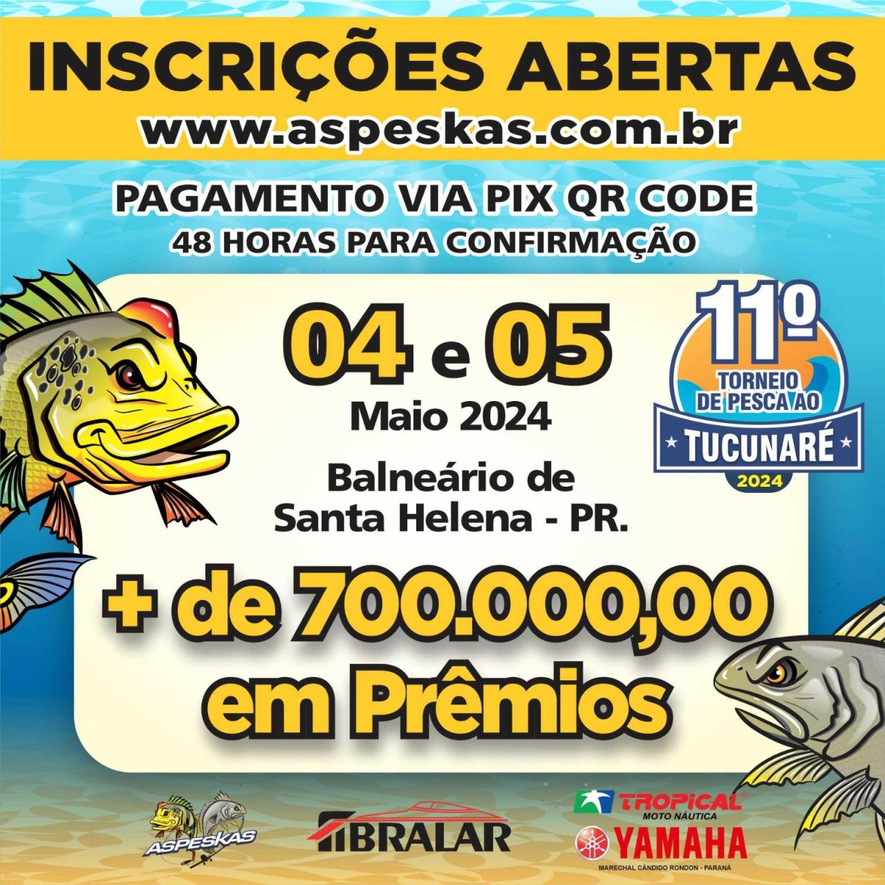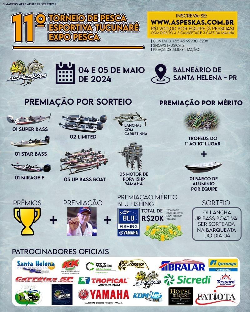 As inscrições para o 11º Torneio de Pesca ao Tucunaré, promovido pela Associação de Pesca Esportiva Kai&Sara (Aspeskas), em Santa Helena, estão abertas desde o dia 7 de março e já registraram um grande interesse por parte dos participantes. O evento ocorrerá dias 04 e 05 de maio e a expectativa é reunir 450 equipes. O Torneio de Pesca ao Tucunaré é considerado um dos maiores da América Latina.