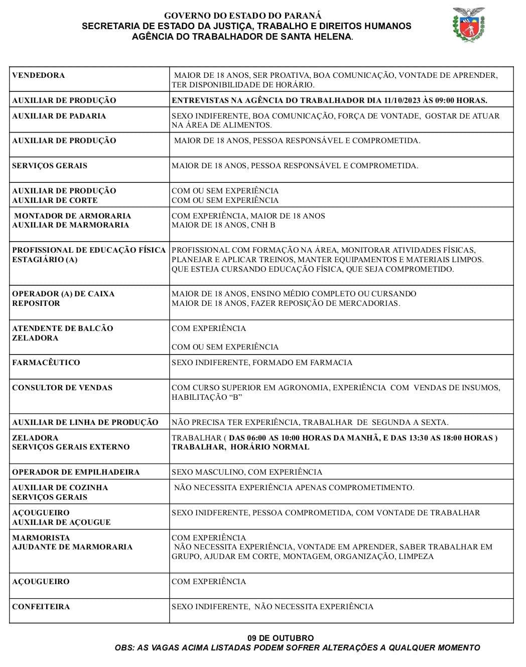 Confira as vagas de emprego disponíveis na Agência do trabalhador de Santa Helena nesta segunda (9/10)